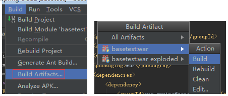 3.在idea顶部菜单栏目中点击Build再选择Build Artifacts产品类型就可以在项目的target目录下生成对应的war;或者直接maven命令package也可以打包