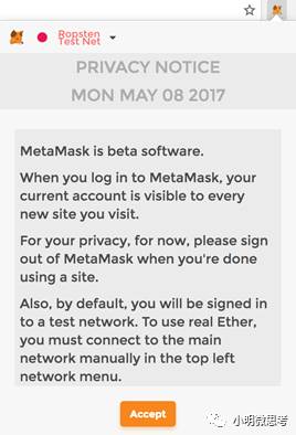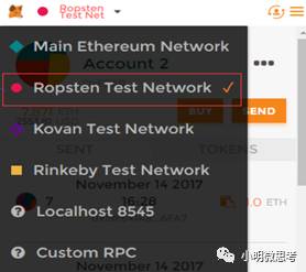 MetaMask默认连接的是以太坊的Main Ethereum Network,为了方便我们测试智能合约,需要切换到Ropsten Test Network。