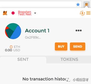 安装完毕后,在浏览器上会显示该插件的小图标,点击下图中“小狐狸”图标,会出现MetaMask的主操作界面。