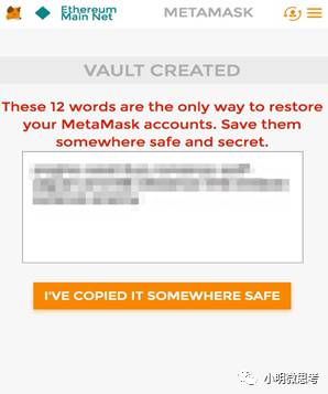 在创建账号的时候为了防止账号密码丢失,这里提供的找回的助记词功能,拷贝恢复账号的安全码,一共是12个单词,切记,这一步很重要,一定要把这安全码记录下来方便恢复账号。