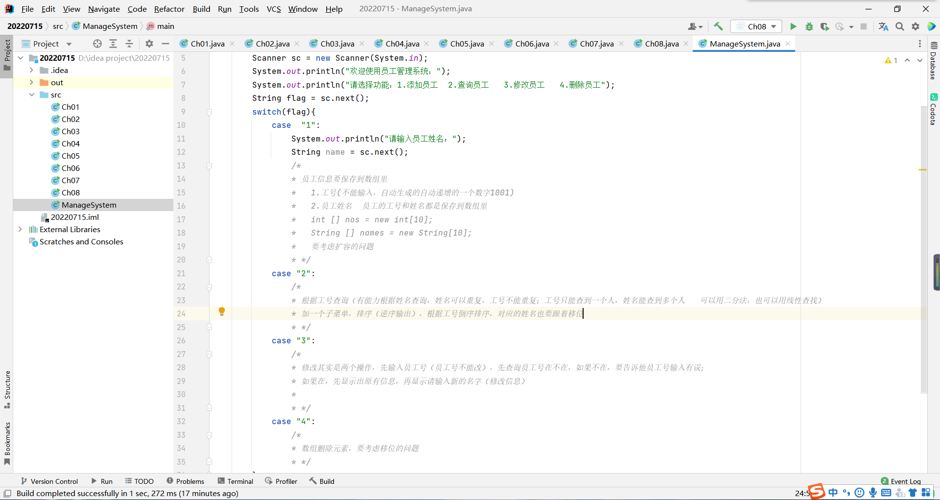 System.out.println("请选择功能: 1.添加员工 2.查询员工 3.修改员工 4.删除员工 5.结束程序");