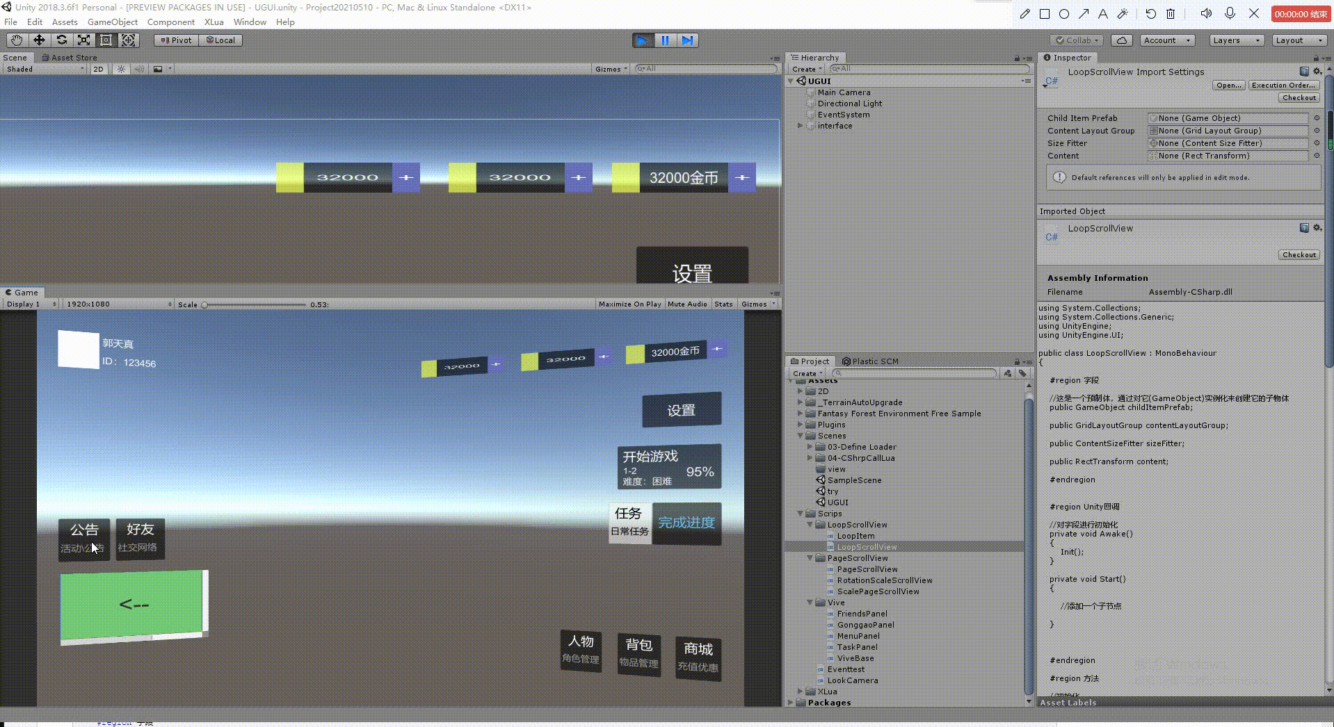 using System.Collections; using System.Collections.Generic; using UnityEngine; using UnityEngine.UI; public class LoopScrollView : MonoBehaviour { #region 字段 //这是一个预制体,通过对它(GameObject)实例化来创建它的子物体 public GameObject childItemPrefab; public GridLayoutGroup contentLayoutGroup; public ContentSizeFitter sizeFitter; public RectTransform content; #endregion #region Unity回调 //对字段进行初始化 private void Awake() { Init(); } private void Start() { //添加一个子节点 } #endregion #region 方法 //初始化 public void Init() { content = transform.Find("Viewport/Content").GetComponent<RectTransform>(); if (content == null) { throw new System.Exception(" content 初始化失败"); } contentLayoutGroup = content.GetComponent<GridLayoutGroup>(); if (contentLayoutGroup == null) { throw new System.Exception(" contentLayoutGroup 初始化失败"); } //判断是否获取到,若没有抛出异常 sizeFitter = content.GetComponent<ContentSizeFitter >(); if (sizeFitter == null) { throw new System.Exception(" sizeFitter 初始化失败"); } } //获取一个子节点 public GameObject GetChildItem() { //此原理为 对象池原理 //查找有没有 被回收 的子节点 (active 为 false 就是有被回收的子节点 ???) for (int i = 0; i < content.childCount ; i++) //for循环遍历出所有的子节点 { if (!content.GetChild(i).gameObject.activeSelf) { return content.GetChild(i).gameObject; } } //如果没有 创建一个 GameObject childItem = GameObject.Instantiate(childItemPrefab, content.transform); //实例化一个游戏物体 childItem.transform.localScale = Vector3.one; //简单设置数据 childItem.transform.localPosition = Vector3.zero; childItem.GetComponent<RectTransform>().anchorMin = new Vector2(0, 1); //设置锚点 childItem.GetComponent<RectTransform>().anchorMax = new Vector2(0, 1); childItem.GetComponent<RectTransform>().sizeDelta = contentLayoutGroup.cellSize; //子物体 设置宽高 LoopItem loopItem = childItem.AddComponent<LoopItem>(); loopItem.onAddHead += this.OnAddHead; loopItem.onRemoveHead += this.OnRemoveHead; loopItem.onAddLast += this.OnAddLast; loopItem.onRemoveLast += this.OnRemoveLast; return childItem ; } //在上面添加一个物体 public void OnAddHead() { } //移除当前最上面的物体 public void OnRemoveHead() { } //在最后加一个物体 public void OnAddLast() { } //移除最后一个物体 public void OnRemoveLast() { } #endregion }