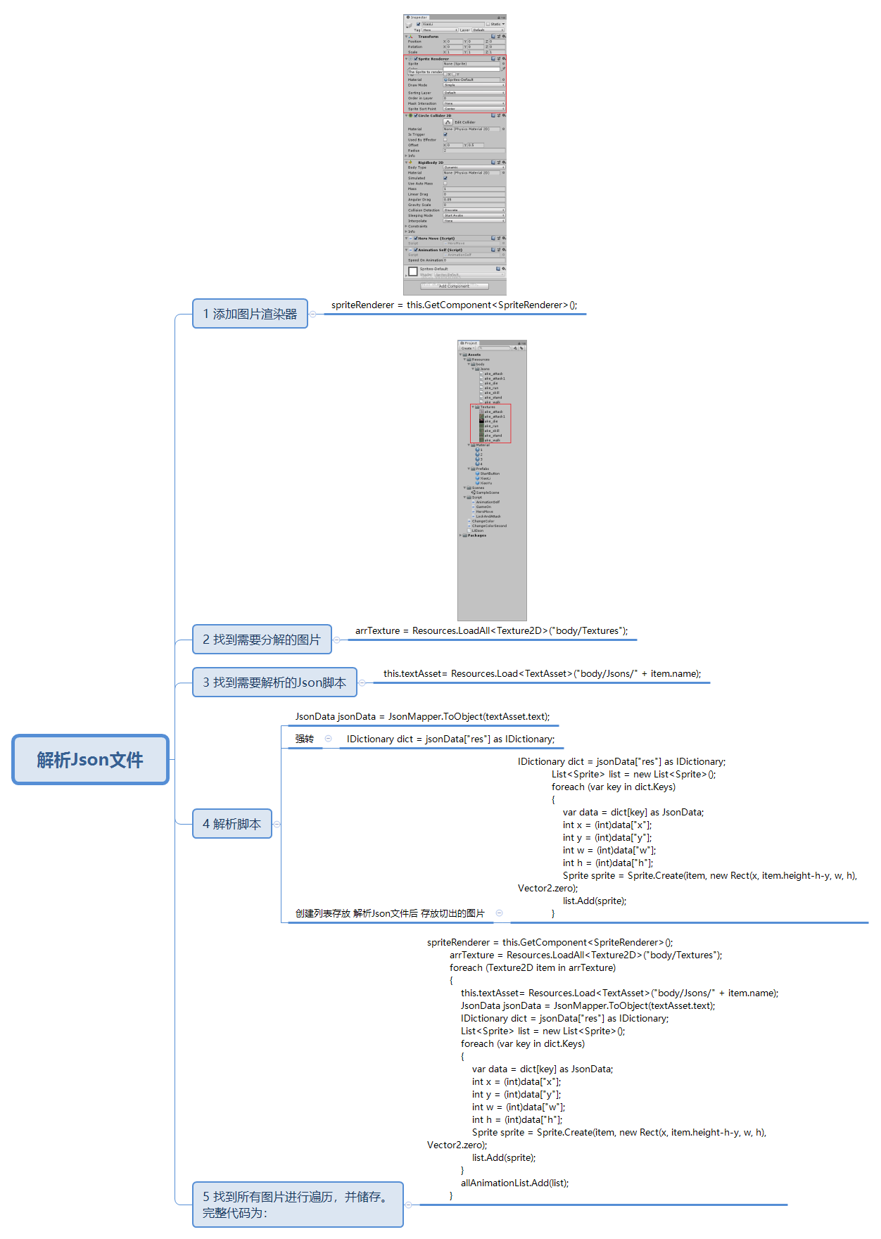 spriteRenderer = this.GetComponent<SpriteRenderer>(); arrTexture = Resources.LoadAll<Texture2D>("body/Textures"); foreach (Texture2D item in arrTexture) { this.textAsset= Resources.Load<TextAsset>("body/Jsons/" + item.name); JsonData jsonData = JsonMapper.ToObject(textAsset.text); IDictionary dict = jsonData["res"] as IDictionary; List<Sprite> list = new List<Sprite>(); foreach (var key in dict.Keys) { var data = dict[key] as JsonData; int x = (int)data["x"]; int y = (int)data["y"]; int w = (int)data["w"]; int h = (int)data["h"]; Sprite sprite = Sprite.Create(item, new Rect(x, item.height-h-y, w, h), Vector2.zero); list.Add(sprite); } allAnimationList.Add(list); }
