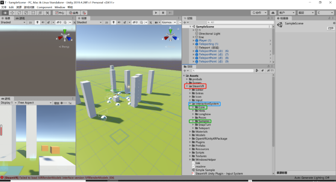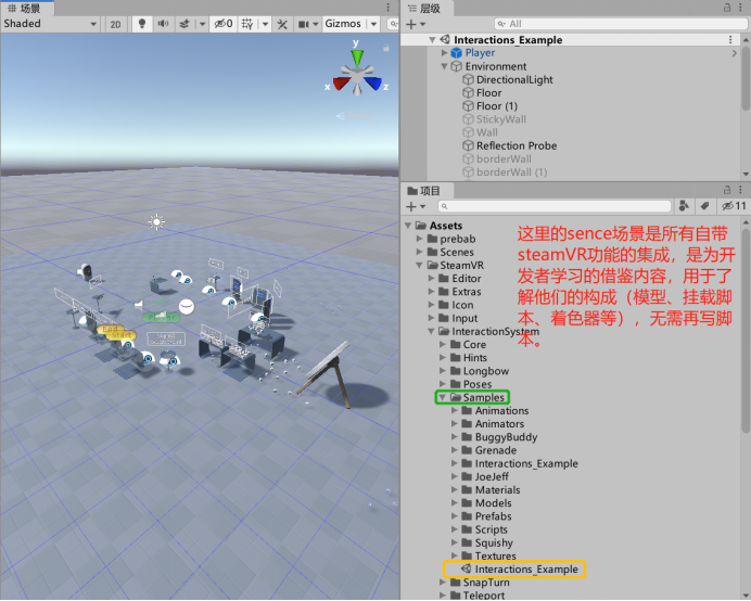 1、在官网下载Steam VR plugin,在plugin中找到InteractionSystem里的Core和Sample,这两个文件内的内容将是构建自己的VR场景的核心。