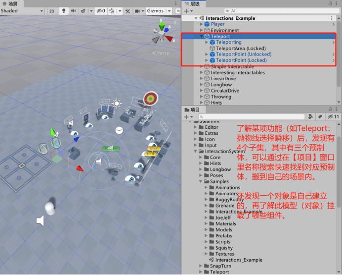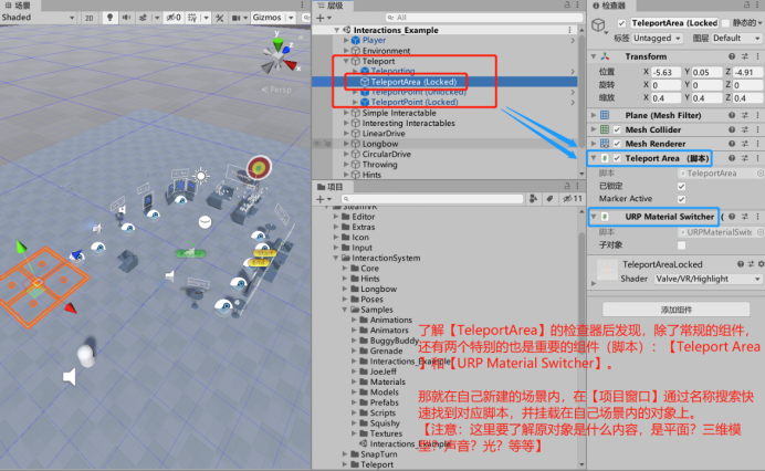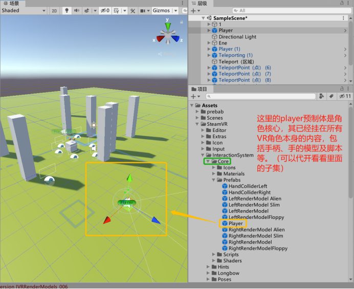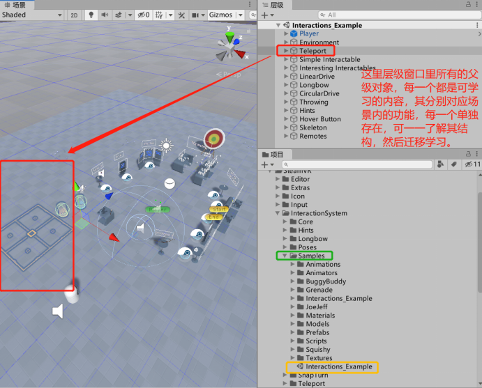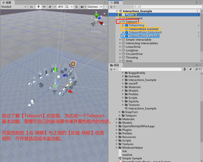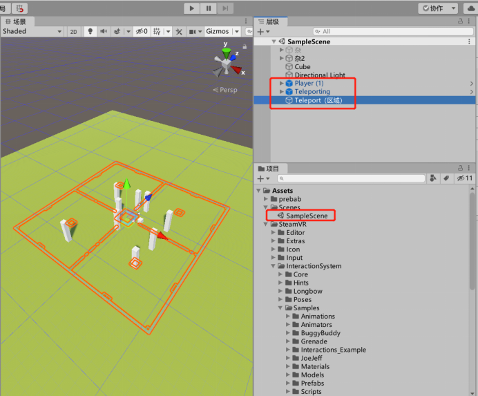 8、了解完【Teleport】内的构成,就可以在自己的场景内搭建基本的VR场景了。同理,其他的功能也以这种思路去借鉴,就可以迅速搭建起相同功能的VR场景了。