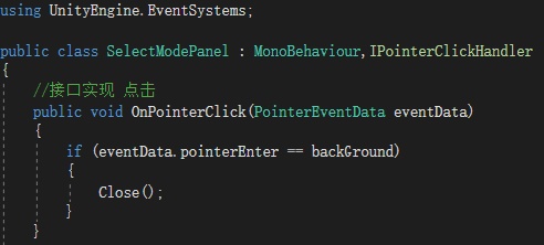 添加命名空间( namespace )using UnityEngine.EventSystems; 使用接口 IPointerClickHandler。