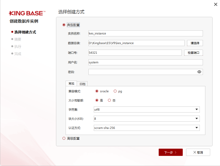 创建方式选择典型配置,使用默认参数,输入密码后点击下一步。
