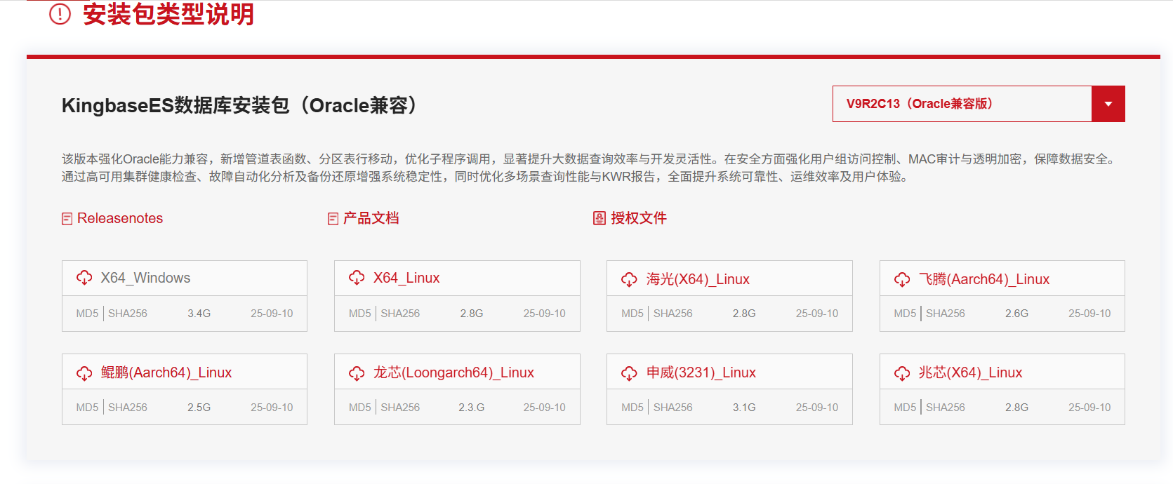 访问https://www.kingbase.com.cn/download.html 进入下载页面,数据库标签下,找到V9R2C13(Oracle兼容版),然后根据自己的系统版本下载不同格式的安装包即可。