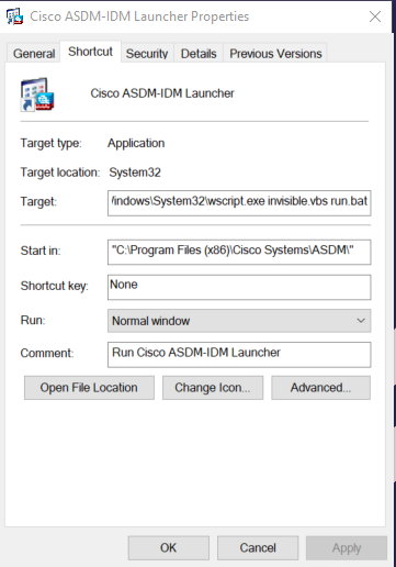 这是因为ASDM安装后调用的wscript.exe目标路径不正确,可以右键点击Cisco ASDM Launcher的快捷方式,修改为:C:\Windows\System32\wscript.exe invisible.vbs run.bat。 即可正常打开。