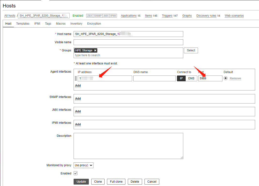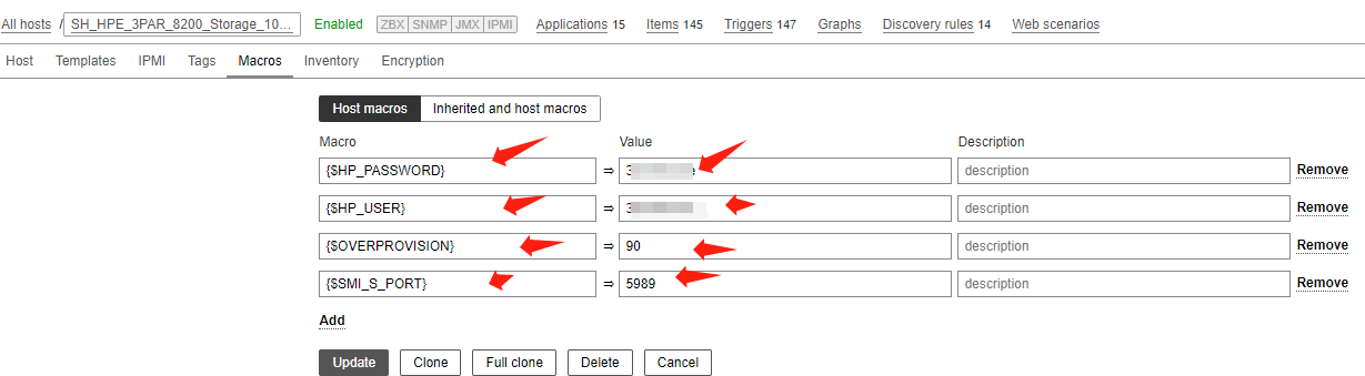 3. 创建监控主机,连接模板,修改Marco,填入创建的用于监控的用户名秘密:
