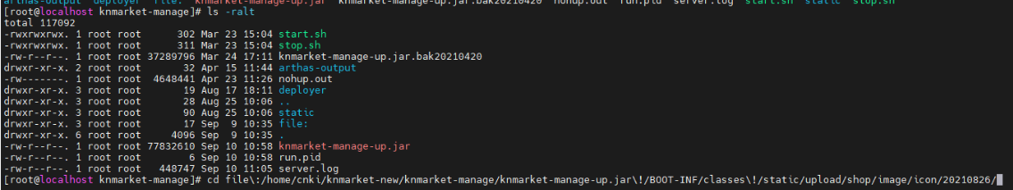 该代码在Windows下是没问题的,但是查看日志发现在linux下目录就变成了奇怪的/home/cnki/项目名字/deployer/tomcat/work/Tomcat/localhost/knmarket-manage-api/file:/home/cnki/项目名字/项目名字.jar!/BOOT-INF/classes!/static/upload/product/pdf/-bash: !/BOOT-INF/classes!/static/upload/product/pdf/