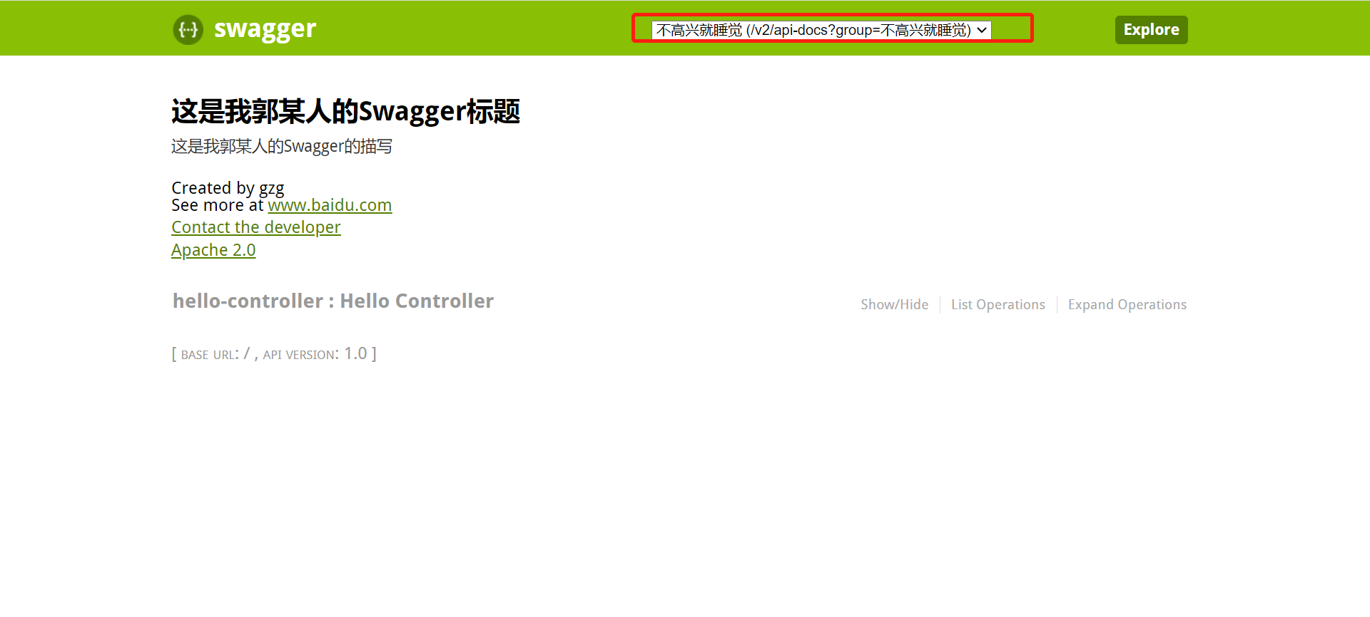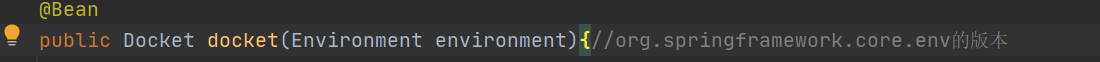 //配置了Swagger的Docket的bean实例 @Bean public Docket docket(Environment environment){//org.springframework.core.env的版本 Profiles profiles=Profiles.of("dev","test");//设置要显示的Swagger环境 //通过environment.acceptsProfiles判断是否处在自己设定的环境当中 boolean flage = environment.acceptsProfiles(profiles); System.out.println(flage); return new Docket(DocumentationType.SWAGGER_2) .apiInfo(apiInfo()) .groupName("虎虎生威,虎年大吉,龙精虎猛")//不能放在.select()后面 .enable(flage) .select()//RequestHandlerSelectors,配置要扫描接口的方式 //指定要扫描的包:basePackage //any()//扫描全部 //none()不扫描 //withClassAnnotation:扫描类上的注解。参数是一个注解的反射对象 //withMethodAnnotation:扫描方法上的注解。例如:GetMapping.class .apis(RequestHandlerSelectors.basePackage("com.gzg.apitest_gzg.controller")) // .paths(PathSelectors.ant("*/Kuang/**")) //paths()过滤什么路径 //.paths(PathSelectors.ant("/")) .build(); //enable是否启动Swagger,如果为False,则Swagger不能在浏览器中访问 }