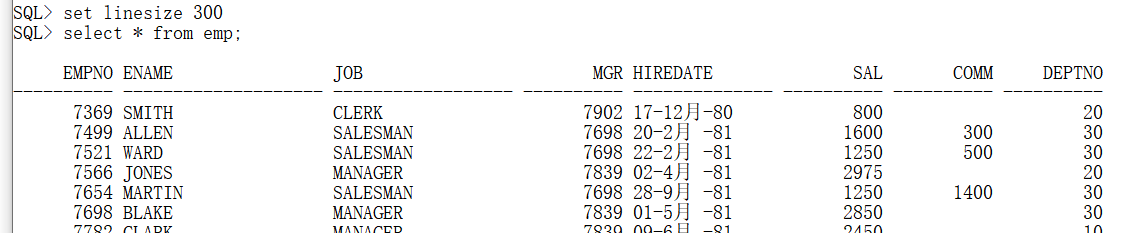 设置行宽:set linesize 200 表示行宽被设置为200的字符