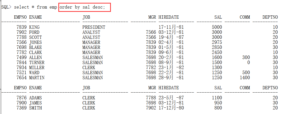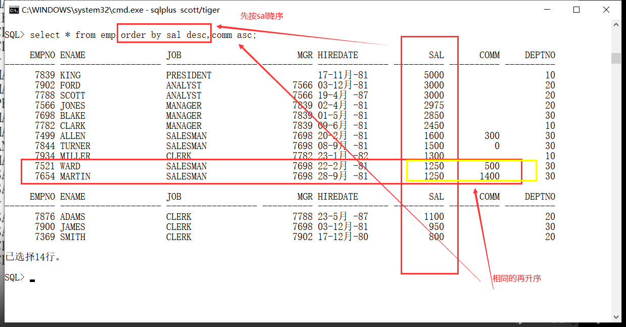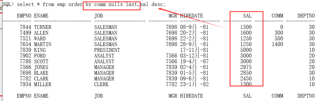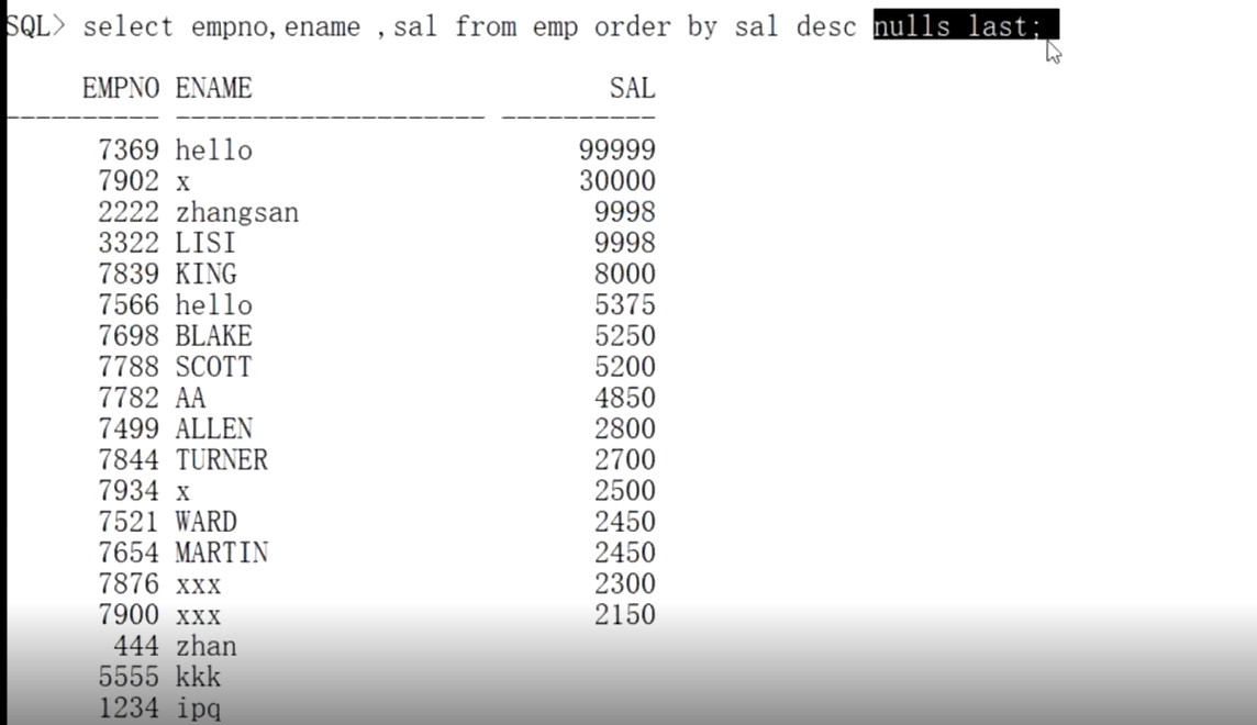 多列排序,比如我先按工资进行降序,再把空值放到最后,为什么空值需要放到最后还需要写语句来操作,因为空值在数据库中是最大的,默认是放到最前面的。