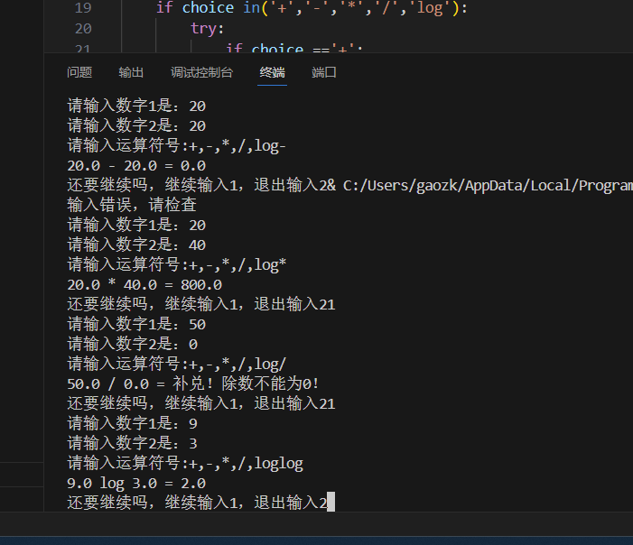 (二)添加取对数算法,并添加结尾是否退出,注意对数函数需要满足真数大于0且底数大于0并且不为1。