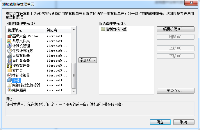 2. 点击 【文件】 , 选择【添加/删除管理单元】,【可用管理单元】 选择 【证书】 点击添加。弹出窗口,