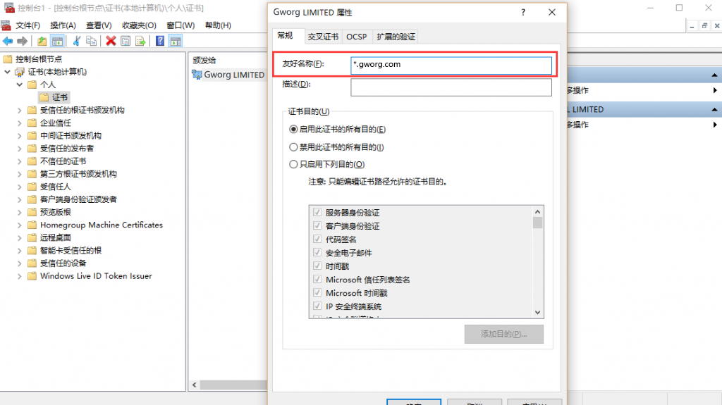 3.【个人 =》 证书】 里面可以看到你刚刚导入的域名, 选中证书,右键属性, 修改友好名称点击确定