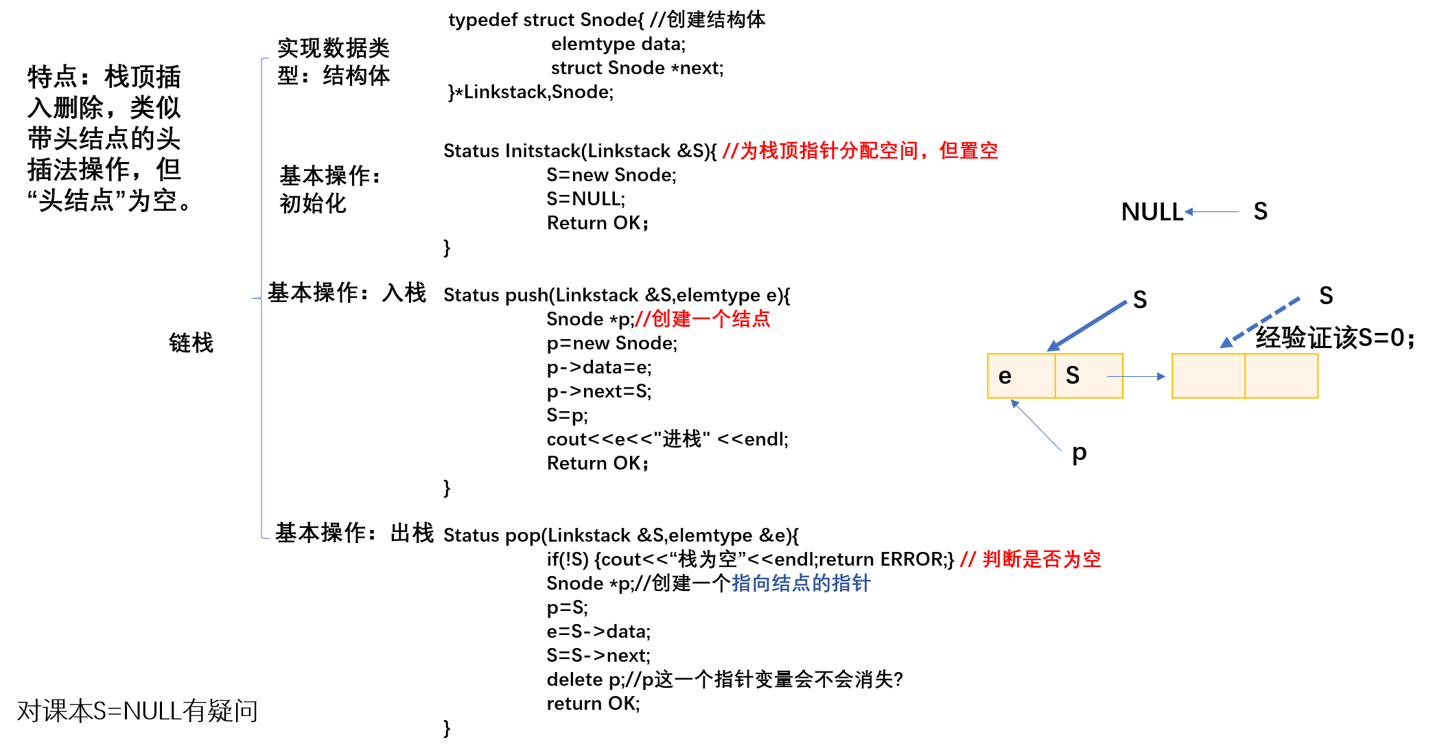 3、对于栈链S=0针和“野指针”不是很明白。