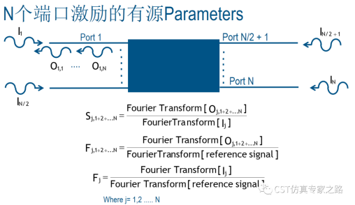 本期介绍如何用在CST里计算有源S参数。所谓有源S参数和常规的S参数不同,是指的多个端口同时激励时候各个端口的响应情况。在CST中用两种有源S参数的表示方式,一种是直接在S-parameter文件夹中生成的结果,而另一种是生成在F-parameter中。两种方式都是用来描述多端口激励时候在某一端口的反射频谱结果,即我们通常认为的有源S参数。有源S参数是有可能大于1的。先把公式放在这里: