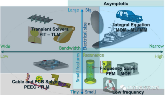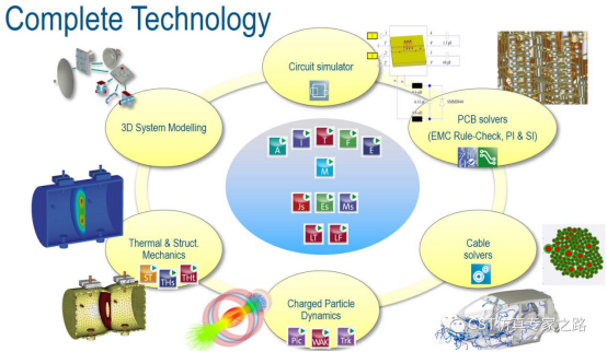 CST软件经过近三十年的发展形成了自己独特技术路线,相较于市面上其他的产品最大的特征就是完备的技术(Complete technology)。本期我们借由对CST历史的介绍,逐渐展开对CST软件的各个算法的特点介绍。CST工作室套装本身就超过20个求解器,能解决从直流、低频到高频,光学,多物理场,PCB,线缆等各个领域的问题。针对不同的领域,不同的仿真任务都有最适合的求解器,如下图: