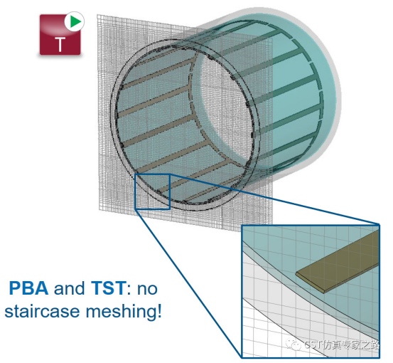 CST独家的PBA技术研发成功是非常重要的里程碑,PBA(Perfect Boundary approximation )的共形网格技术能极大的提升时域求解器计算精度和网格效率,使得CST软件在整个全球电磁数值软件的市场发展速度上一骑绝尘,市场占有率的增长远远超过整个市场的发展速度。值得注意的是,由于出发方程不同,FIT和FDTD就不是一个算法。CST的PBA技术包括随后发布的TST薄片技术,使得CST在一个网格内能处理多种材料,经过二十多年的不断技术进步和迭代,PBA网格已经是第N代产品(N>5),相比初代产品,模型的通用性和精度性能都已经不可同日而语。