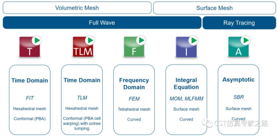 跨入2000年后,各家电磁仿真软件的公司都拿着自家主流的算法,开启了诸侯混战的局势。对于CST的技术路线而言,就是本文开头提到的海纳百川,对于微波工作室部分而言,对各个主流算法都进行了自研开发,逐步形成了完整的布局,如下图所示: