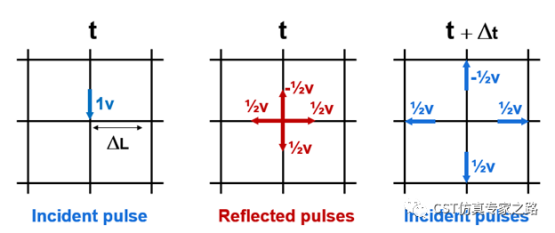 1971年:PeterB. Johns 教授首先提出了二维TLM数值算法。想象网格是传输线,在t时刻,中心节点上有1V信号波抵达;在t+Δt时刻,信号波按四个方向扩散,幅度均为0.5V,满足能量守恒,只是反射波符号相反。由此类推,接下来的t+2Δt,t+3Δt时刻,波继续在下一节点扩散,幅度变为0.25V,0.125V等等。这里需要网格尺寸小于波长十分之一。