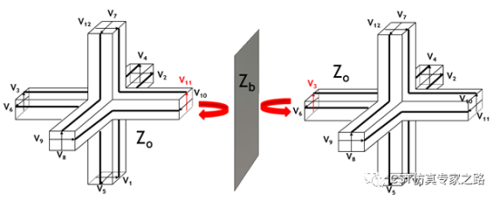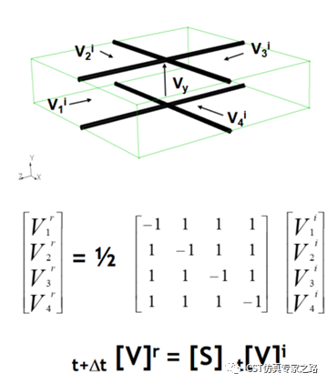 1975年:Peter B. Johns 教授提出了三维TLM数值算法,简单说就是之前的单线加上并联的参考面上的线,传播矩阵就可以立体化了。这里当然是满足基尔霍夫电压定律(KVL)。