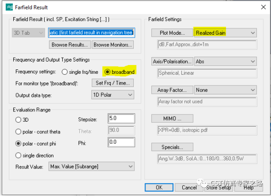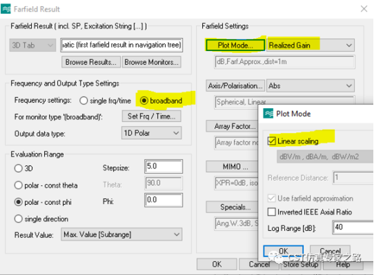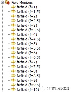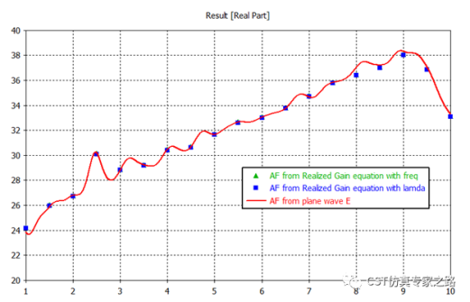 如果不用平面波模拟接收信号,我们可以从天线远场的增益来计算AF。因为要得到AF在不同频率的值,所以需要多个频点的远场结果,需要多个远场监视器,计算相对方法1较慢: