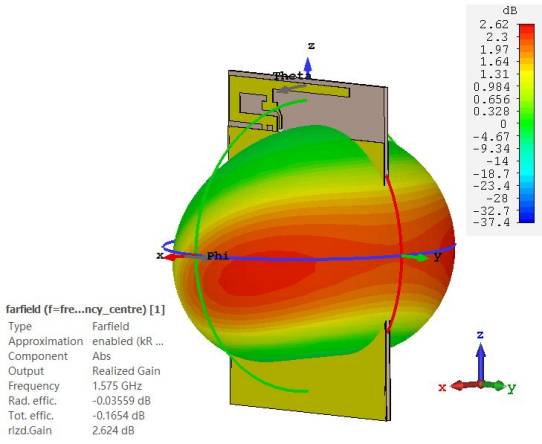 要进行方向图分析,需要设置一个远场频点的监视器,例如1.575GHz。然后仿真得到天线的远场方向图如下图所示: