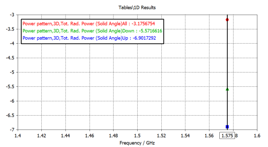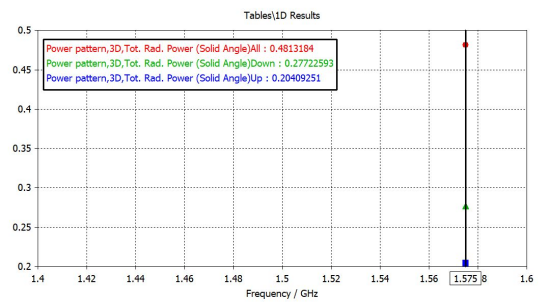 这样的结果更直观一些,总功率是0.5w,进入天线并被辐射的功率是0.483w,其中0.204向上半球空间辐射,0.277向下半球空间辐射,上半空间辐射占比是0.42。
