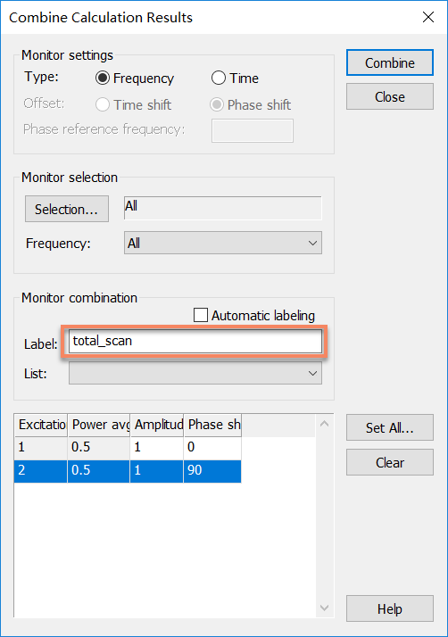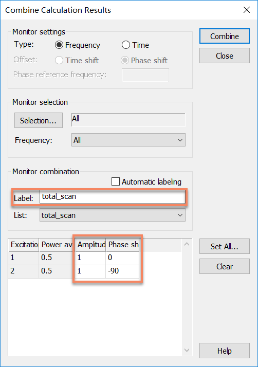 这里我们将两个端口的幅度都设为1,port2与port1,相位差-90度,并取名为total_scan,如下图所示:
