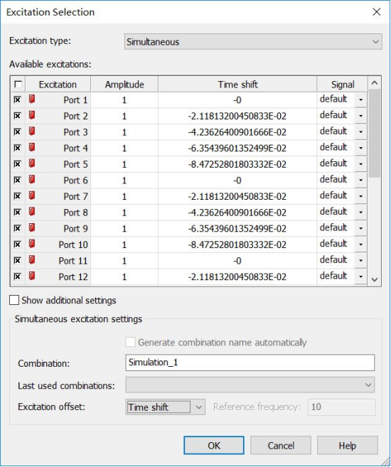 例如Scan_theta=30;Scan_phi=0时,各个端口激励的Time shift (Phase shift)如下图所示: