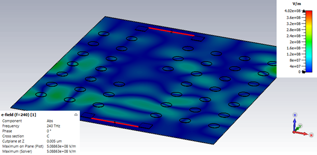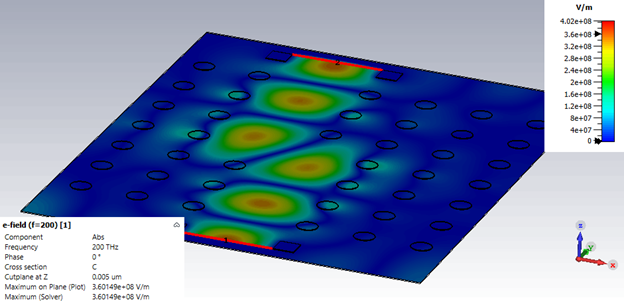 然后我们换成T-solver,加上两个场监视器分别在200THz工作频率和240THz 阻断频率,便可以开始仿真。以下图结果可看到200太赫兹有波导效果,240太赫兹就没有。