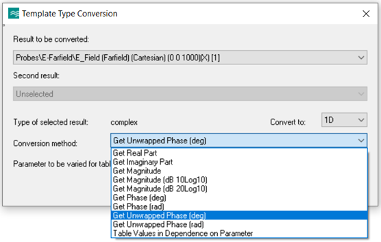 用后处理General1D -> Convert Template Type, 然后选择探针结果,以X方向结果为例,选择“unwrap the phase(deg)”。这样获取的相位才能用来计算Groupdelay。