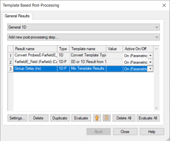 根据需要修改名字,这里我们将“Mix1D“改为"Group Delay (ns)"。运行三个后处理(Evaluate All),便可得到三个结果曲线: