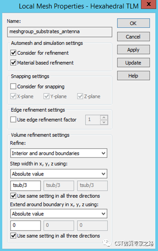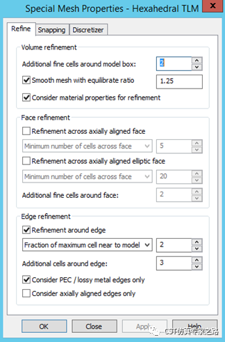 注意这里建议用绝对值并且三个方向一样,因为天线将被旋转,绝对值的网格定义才能保证精确度;也正因为这样,网格设置的Specials里面,snapping就可以不勾选。有了本地加密,face refinement可以选择不需要。Smooth mesh with equilibrate ratio为1.25,网格尺寸变化比较平滑。