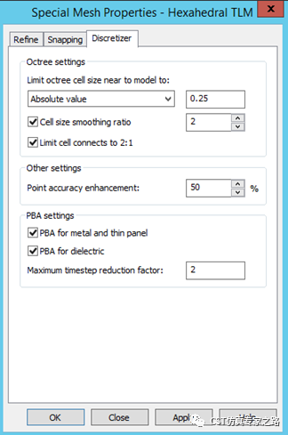 Limit octree cell size near to model to 是限制结构内部的最大网格,根据馈点处的结构尺寸适当定义。其他设置之前TLM相关文章也有解释和推荐过: