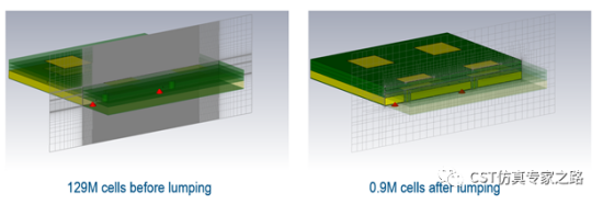 下面展示的是TLM的Octree网格在lumping之后,比正常的延展的六面体网格会少很多。密集的网格只聚集在结构周围,这样就允许结构旋转而网格数不会剧增。