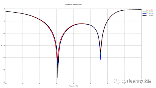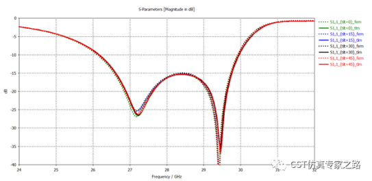 下面S11结果表示,用推荐的网格设置,不同旋转角度得到同样的结果,说明网格准确性非常好。