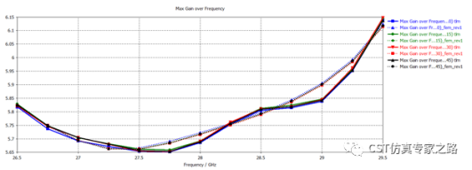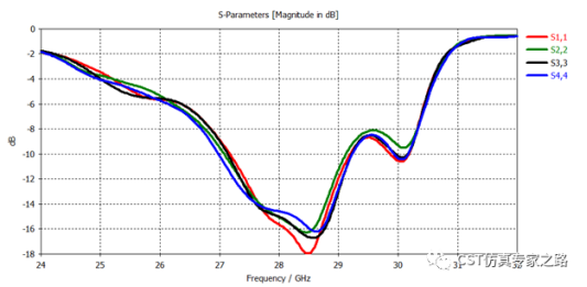 天线工作频率为毫米波波段n257, 26.5-29.5GHz, 仿真频率为24GHz-32GHz,也可以更宽的频率范围,比如0-40GHz,包括其他的毫米波段。