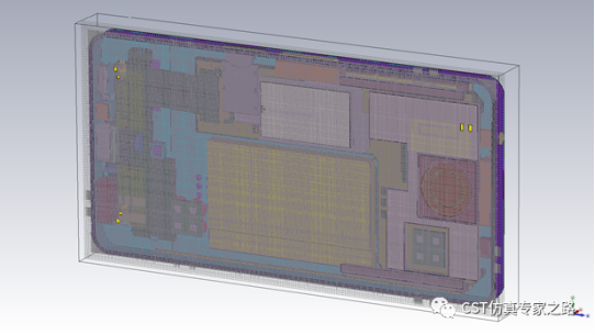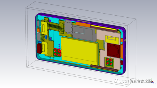 第二步是手机厂商的仿真,这里我们用两个天线原模型分别放在演示手机模型上下两个位置,用保密模型效果也是一样。所以手机模型整机端口数为16,手机内部结构略有简化,但是多层的PCB板,柔性PCB,各种频段天线仍然是都包括在内。