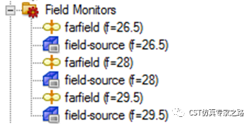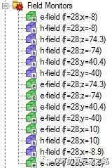 一般我们在n257波段看三个频点就够了,这里定义三个场源和三个远场监视器。场源是为了导出用于后处理得到功率密度,远场是要看查看天线效果并且在接下来的收敛标准需要用到。这里之所以不直接定义功率监视器或电场磁场监视器,是因为我们要节省三维数据量,5G的波束扫描需要多个端口,加上频点多,如果不加控制,三维场很容易达到上百个,仿真效率大大降低,硬盘也将占据大量空间。