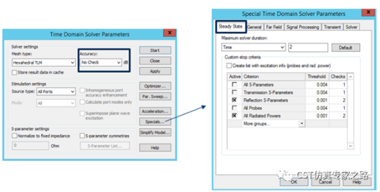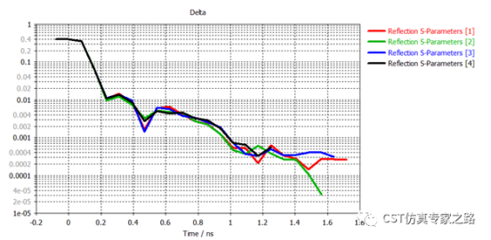 收敛标准是个时域的小技巧。通常我们都是看能量衰减,比如-40dB甚至更低,但这里能量是指宽频的能量,不是所有频率都容易衰减。所以我们可以用自定义收敛标准替代能量衰减,比如5G天线更关心工作频段的S11反射和辐射功率的准确性,所以我们可以选Reflection S-Parameters和All Radiated Power都是收敛到0.001,或是根据需要设的更低,然后检查两次,确保收敛曲线稳定下来。这里的辐射功率收敛就和之前的远场监视器计算挂钩了。