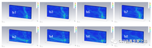 同样是手机厂商的工作范畴。下图是8个场源导入到I-solver里面,对应的是4个端口,双极化。实际上场源可以达到上百个。我们提供新的Macro宏脚本可以从上一步的手机仿真cst文件中自动识别并导入所有的场源,还可以自动导入激励的振幅相位表来做波束扫描。有需要的用户可联系CST的技术人员。