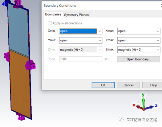 传播方向为X,我们仿真的算是二维的结构,所以端口细长。这种二维的波导我们需要限制两边边界为磁边界,这样TM模式才能激励出SPP。当然实际的波导需要好好设计截面,使模式聚集,而不是用理想磁边界。这里只是为了分析二维SPP模式。