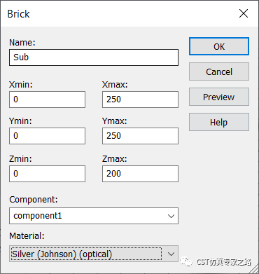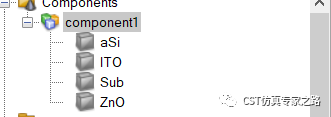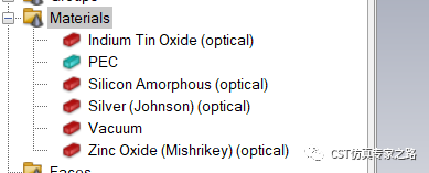 材料库提取四个材料,非晶硅(a-Si), 氧化锌(ZnO),银(Silver)和氧化铟锡(Indium Tin Oxide。需要安装好CST材料拓展包。