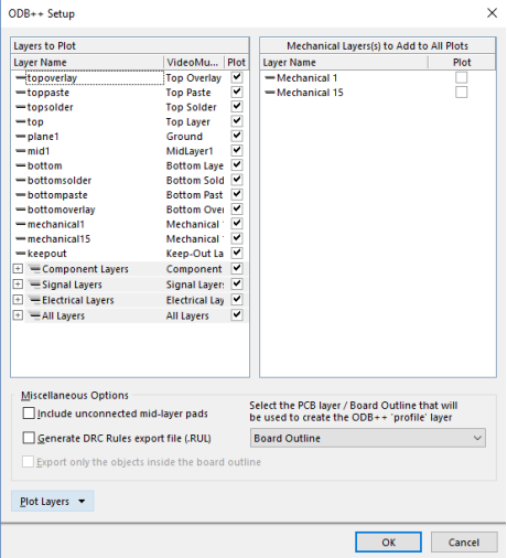 确保选中此窗口的“Layer to plot”的所有的框,然后按“OK”。Altium现在将自动生成所有必要的制造文件。这可能需要一些时间。文件生成完成后,Altium将在保存PCB文件的目录中生成一个名为odb的新文件夹。通常的文件后缀是.zip .tgz .gz。