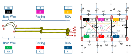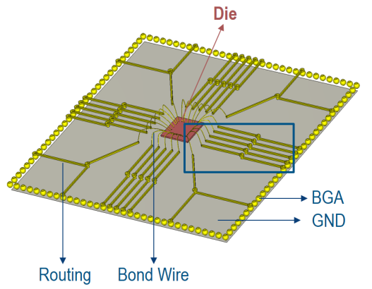 我们会用pRLCG求解器来提取下图虚线出的寄生参数,从BGA->routing->Bond Wire。