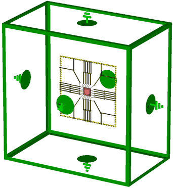 边界条件目前支持电壁和磁壁两种。如果没有设置RLC Ground的情况下,电壁上的电势为零,而磁壁则代表平均电势为零。如果设置了RLC Ground,则RLC Ground的电势为0。边界条件的大小以及类型都会影响到仿真结果,所以需要特别搞清需要的物理含义和状态。本例中的边界如下图所示: